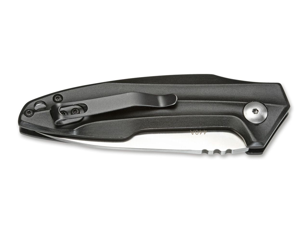 Nóż sprężynowy dedykowany do użytku codziennego - EDC. Ostrze o profilu spear-point wykonano ze stali nierdzewnej 440A. Karbowanie na grzbiecie głowni poprawia pewność oparcia kciuka podczas precyzyjnych prac z narzędziem.
