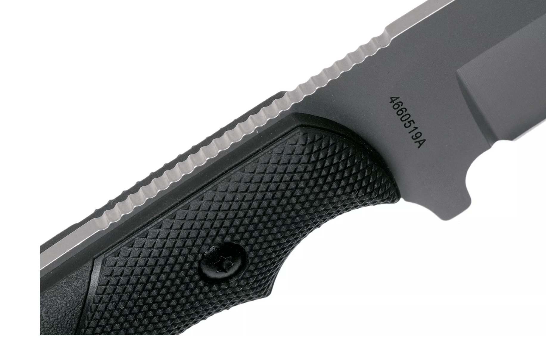 Rękojeść noża ma ergonomiczny kształt i jest uzupełniona o wgłębienia na palce, co zapewnia wygodny chwyt. Ostrze wykonane jest z wysokiej jakości stali nierdzewnej 5Cr15MoV, którą łatwo utrzymać w ostrym stanie. Wszystkie metalowe elementy noża, w tym ostrze, mają matową szarą powierzchnię spowodowaną piaskowaniem.