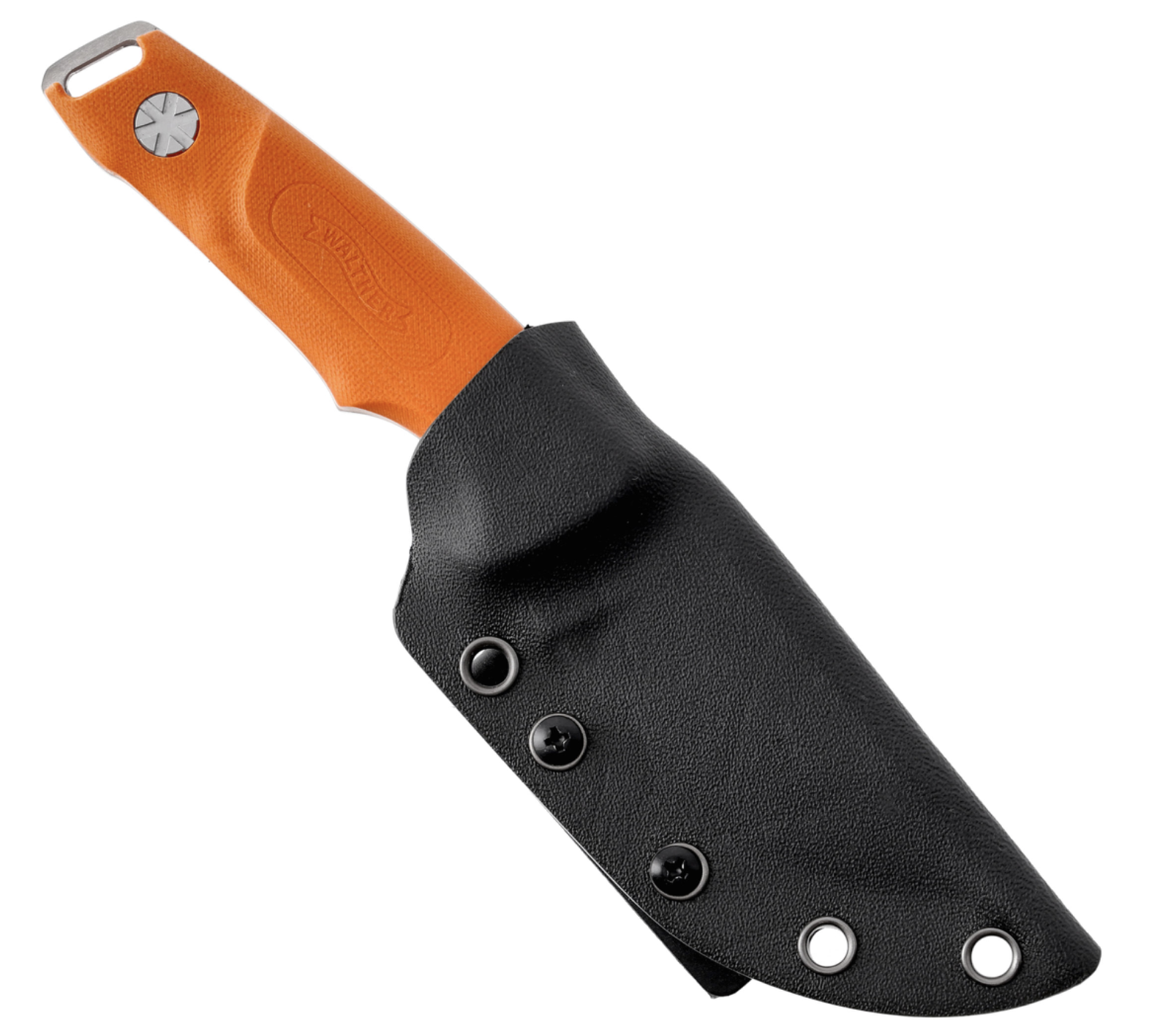 Chwyt noża Walther HBF 1 wykonany został z niezwykle trwałego a przy tym higienicznego kompozytu G10. Materiał ten bazuje na tkaninie z włókna szklanego sprasowanej przy pomocy żywicy i charakteryzuje się ekstremalną wytrzymałością. Kontrastowy kolor zastosowanego tworzywa sprawia, że nóż myśliwski HBF 1 jest niezwykle łatwy w odnalezieniu po upadku w ściółkę lub trawę. Odpowiedni profil chwytu sprawia natomiast, że model jest niezwykle wygodny oraz bezpieczny w użytkowaniu. Dzięki zastosowaniu kydexowej pochewki nóż jest niezwykle łatwy w dobyciu. Nie musimy ponadto obawiać się o jej kondycję umieszczając w niej ubrudzone narzędzie - syntetyczna konstrukcja jest bardzo łatwa w czyszczeniu.