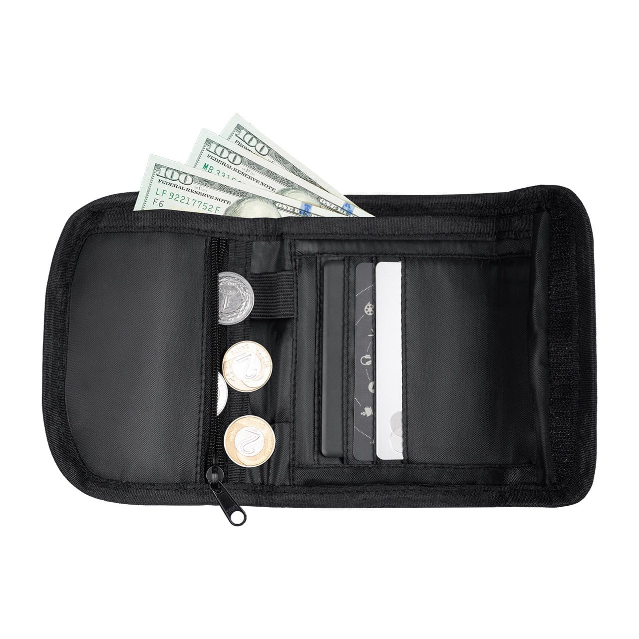 Z tyłu portfela została umieszczona kieszonka zapinana na suwak, do której można schować np. klucze. Zapinana na zamek mniejsza kieszeń wewnątrz jest idealna na przechowywanie monet, zaś większa na banknoty. Otwarta duża kieszeń przeznaczona jest do chowania pieniędzy, ale będzie również odpowiednia do umieszczenia ważnych dokumentów np. dowodu rejestracyjnego pojazdu. Dodatkowo portfel posiada cztery kieszenie, np. na karty płatnicze, dokumenty osobiste.