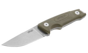 Nóż ma okładziny z wykonane z płóciennej micarty, które gwarantują świetną przyczepność nawet w trudnych warunkach atmosferycznych. Rękojeść ma profilowany kształt, z powiększonym wycięciem na palec, co poprawia chwyt noża i komfort użytkowania. Otwór w tylnej części można wykorzystać do wplecenia ozdobnego oplotu lub linki zabezpieczającej. Do noszenia noża służy lekka pochewka z kydexu z uniwersalnym mocowaniem na pas.